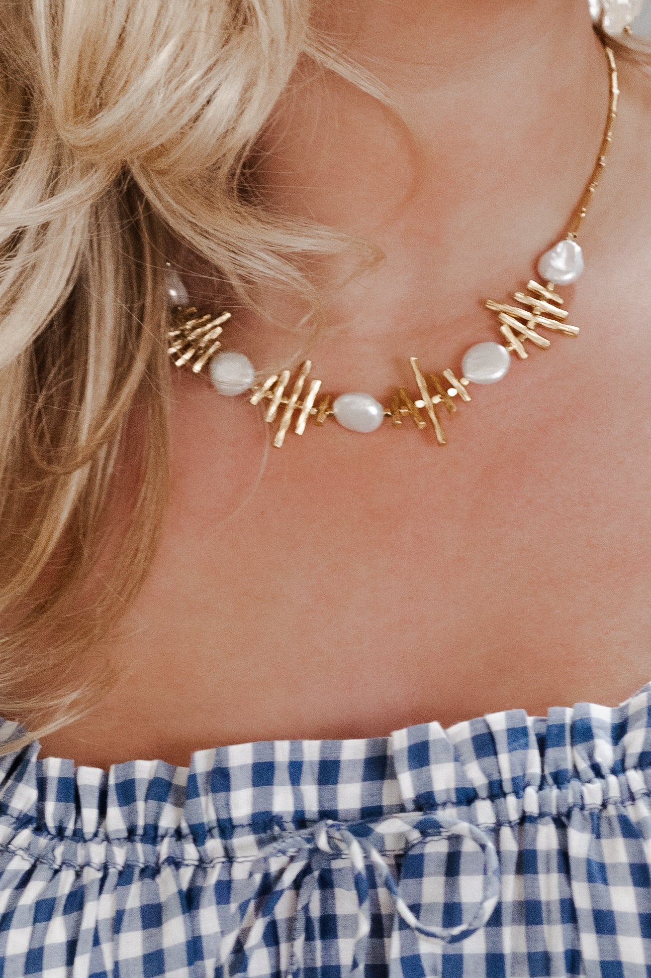 Handmade necklace using polished brass and freshwater pearls. Freshwater pearls are known for their calming properties and are said to aid purity and loyalty in its wearer.