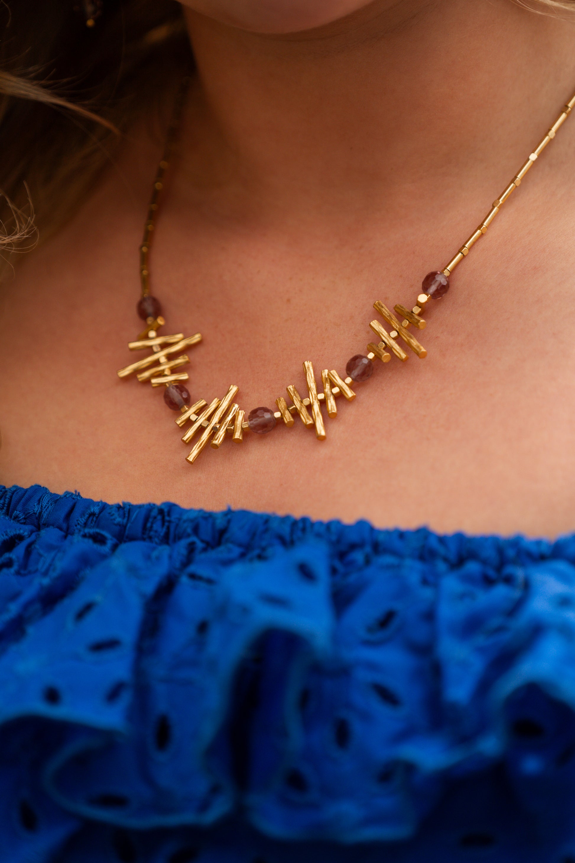 Handmade necklace using polished brass and zultanite. Zultanite is a rare, colour-changing semi-precious stone, only sourced from the Anatolian Mountains in Turkey. It is known for its ability to shift colours, transitioning from vibrant green hues to warm pink or purple tones depending on the light source. Zultanite stones are said to promote mental clarity, helping clear stress and forgetfulness.